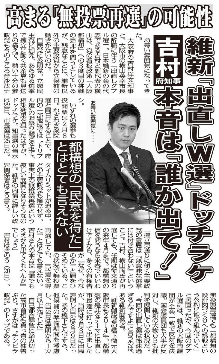 吉村知事は20日、無投票再選でも「都構想の設計図づくりへの挑戦という公約に取り組んでいく」と居直ったが、今回のダブル選には、維新の大阪市議団が全会一致で反対を決議。国会議員団も大半が反対し、維新の大物OBも批判を展開している状況だ。
