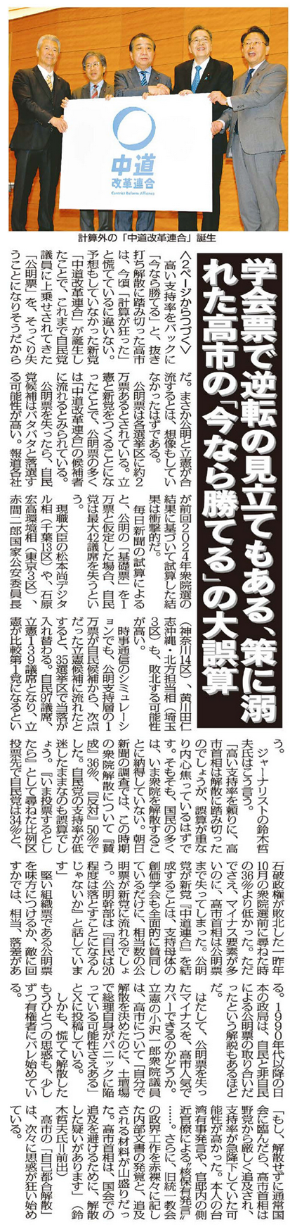「高い支持率を頼りに、高市首相は解散に踏み切ったのでしょうが、誤算が重なり内心焦っているはずです。そもそも、国民の多くは、いま衆院を解散することに納得していない。朝日新聞の調査では、この時期の衆院解散について『賛成』36%、『反対』50%でした。自民党の支持率が低迷したままなのも誤算でしょう。『いま投票するとしたら』として尋ねた比例区投票先で自民党は34%と、石破政権が敗北した一昨年10月の衆院選前に尋ねた時の36%より低かった。ただでさえ、マイナス要素が多いのに、高市首相は公明票まで失ってしまった。公明党が新党『中道連合』を結成することは、支持母体の創価学会も全面的に賛同しているだけに、相当数の公明票が新党に流れるでしょう。公明幹部は『自民は20程度は落とすことになるんじゃないか』と話しています」