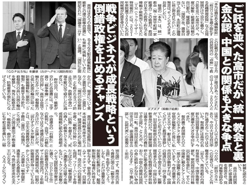 疑惑の「本丸」は、統一教会(現・世界平和統一家庭連合)との癒着だ。教団が日本での政界工作などを韓鶴子総裁宛てに伝えた「TM(トゥルーマザー)特別報告」には、2021年衆院選で290人もの自民候補が応援を受けていたとの記載がある。22年9月の自民党内の「点検」で教団と接点があったとされたのは179人。290人とは実に100人以上の差があり、やはり大甘な自己申告に過ぎなかったのではないか。報告書には高市の名前も32回登場する以上、今度の選挙の大きな争点にすべきだ。