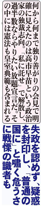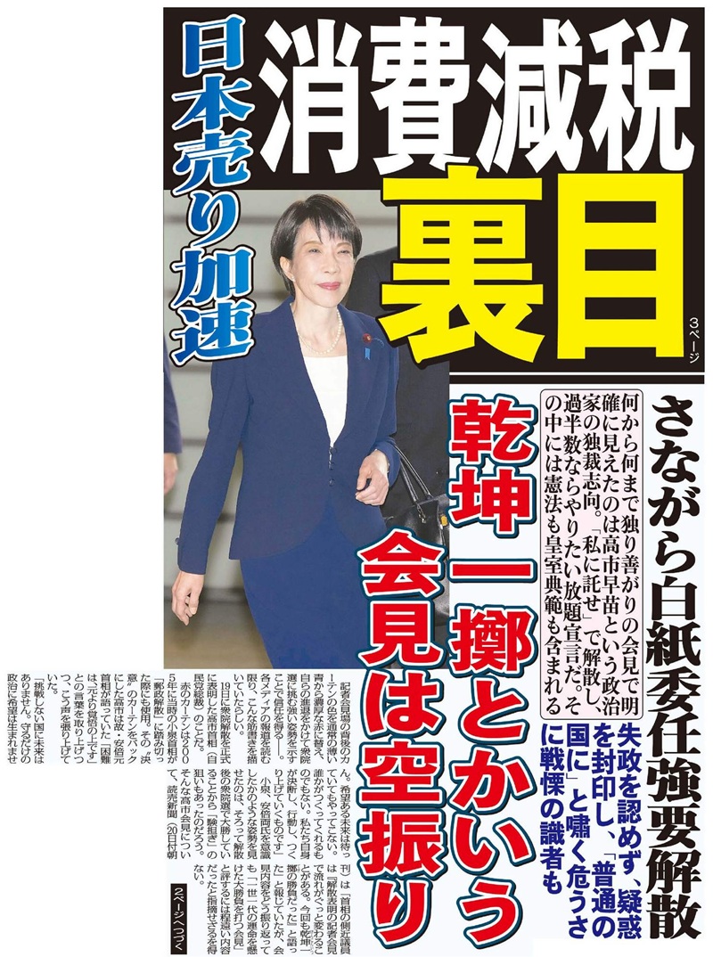 そして仮に高市が白紙委任状を握ったら最悪だ。その中には憲法も皇室典範も含まれるからだ。失政を認めず、疑惑を封印し、「普通の国になるだけ」と嘯く危うさに元外務審議官の田中均氏も戦慄を覚えたようだ。