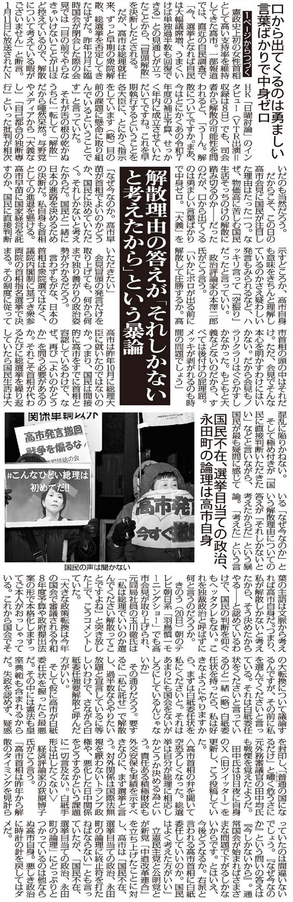 <高市首相の弁を聞いて空恐ろしくなった。総選挙は自分が総理に相応しかどうか決める為という。責任ある積極財政も外交安保も実績を示すべきなのに、まず選挙と言う。対外関係は国際法無視を厭わないトランプ政権や、悪化した日中関係をどうするかという課題に一切言及ない。白紙手形は出したくない>