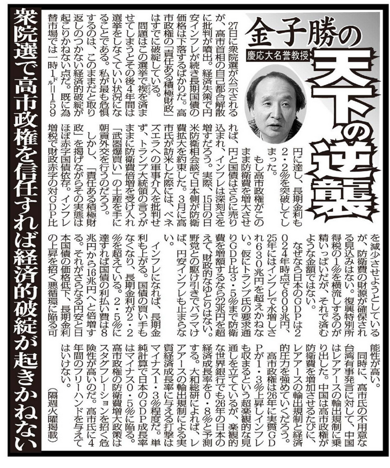 高市政権は26年に実質GDPが1.3%上昇しインフレも収まるという超楽観的な見通しを立てているが、楽観的な世界銀行でも26年の日本の経済成長率を0.8%と予測する。大和総研によれば、レアアースの輸出規制による実質経済成長率に与える打撃はマイナス1.3%程度だ。単純計算で日本のGDP成長率はマイナス0.5%に陥る。高市政権の防衛費増大政策はスタグフレーションを招く危険性が高いのだ。高市氏に4年間のフリーハンドを与えてはいけない。