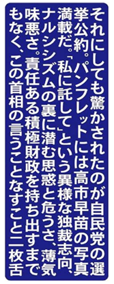 それにしても驚かされたのが自民党の選挙公約。パンフレットには高市早苗の写真満載だ。「私に託して」という異様な独裁志向、 ナルシシズムの裏に潜む思惑と危うさ、薄気味悪さ。責任ある積極財政を持ち出すまでもなく、この首相の言うことなすこと二枚舌。