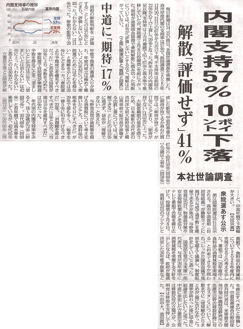 毎日新聞が1月24、25日に実施した全国世論調査で高市内閣の支持率が昨年12月実施の前回調査の67%から10ポイント減の57%と大きく下落した。