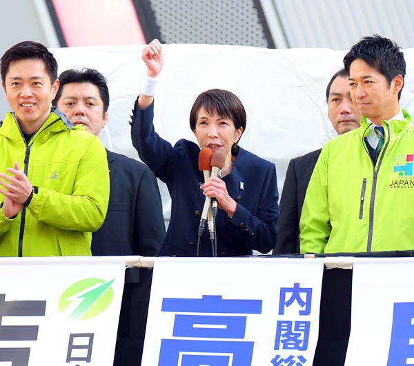 軒並み支持率急落(衆院選が公示され、第一声を上げる自民党総裁の高市早苗首相=中央、27日) /(C)日刊ゲンダイ