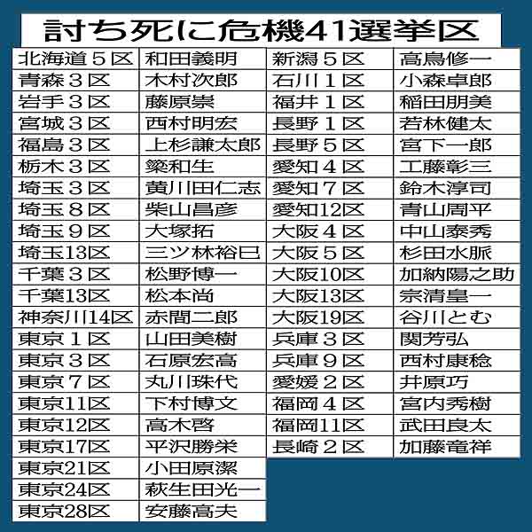 現職の4閣僚も危うい。松本尚デジタル相(千葉13区)に石原宏高環境相(東京3区)、赤間二郎国家公安委員長(神奈川14区)、黄川田仁志沖縄・北方担当相(埼玉3区)は公明票が剥がれると落選危機だ。