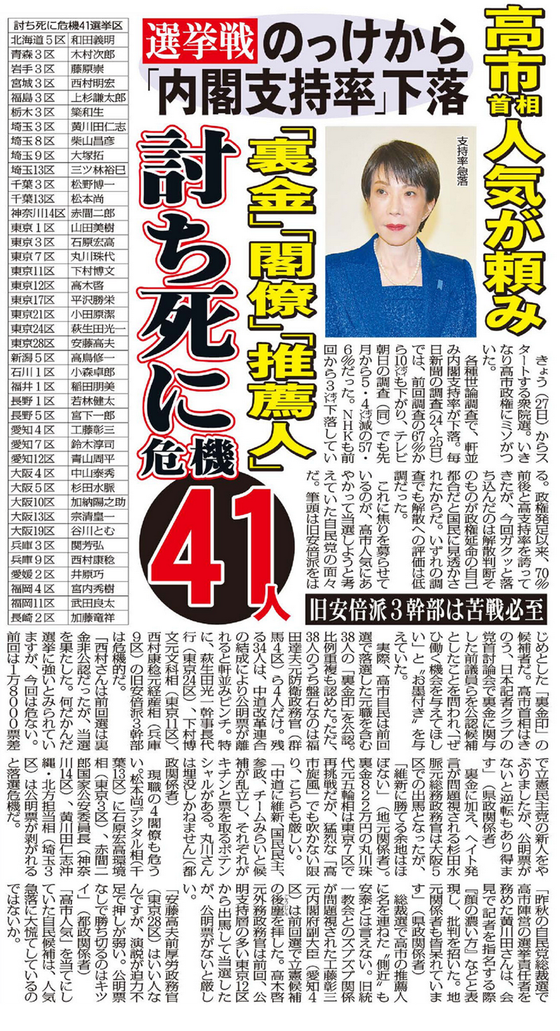 【表あり】高市首相人気頼み「裏金」「閣僚」「推薦人」は内閣支持率ダウンで真っ青!“討ち死に”危機41人の名前