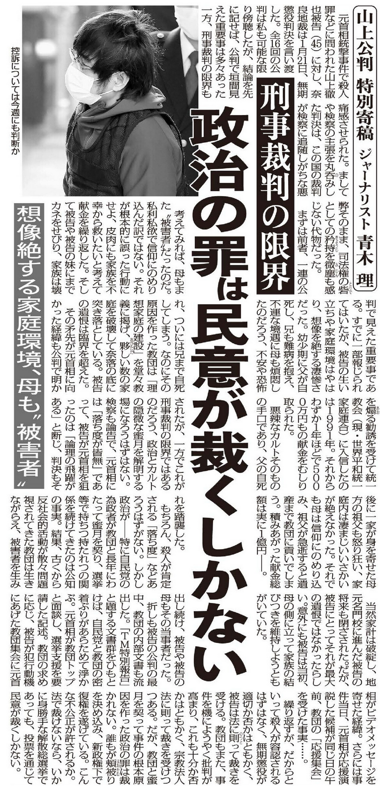その矛先が元首相に向かった経緯も公判で明かされたが、一方でこれが刑事裁判の限界ではあるのだろう、政治とカルトの隠微な蜜月を解明する場になろうはずはない。検察も論告で、元首相には「落ち度が皆無」であって、被告が元首相を狙ったのは「論理の飛躍がある」と断じ、判決もそれを踏襲した。