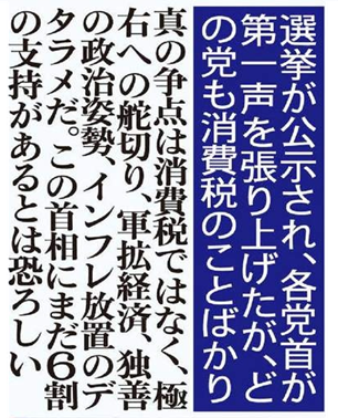 どの党も消費税のことばかりなのだが、真の争点は消費税ではないだろう。極右への舵切り、軍拡経済、独善の政治姿勢、インフレ放置のデタラメなど挙げればきりがないが、とりわけ重要なのは「極右の独裁者に白紙委任でいいのか」ということだ。