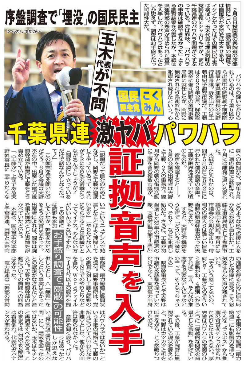 2月8日投開票の衆院選の序盤情勢について、読売新聞の調査では自民党が支持を拡大させる中、イケイケだったはずの国民民主党は横ばい。玉木代表は埋没気味の党勢回復にシャカリキだが、まだ千葉県連のパワハラ問題がくすぶっている。党は昨秋、「パワハラの事実は確認できなかった」とする調査結果を公表したが、本紙は県連幹部の怒声が収められた音声を入手した。パワハラはあったとしか思えず、調査はお手盛りだった可能性大だ。