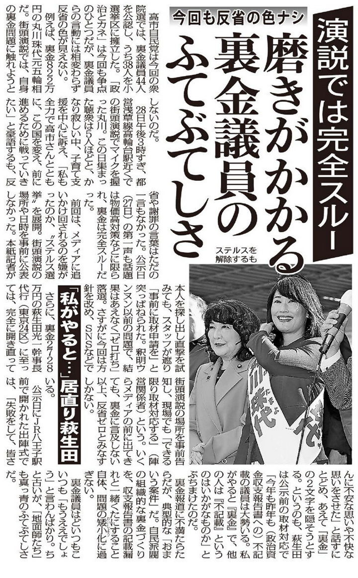 前回は、メディアに追いかけ回されるのを嫌がったのか、“ステルス選挙”を展開。街頭演説の場所や日時を事前に公表しなかった。日刊ゲンダイの記者が本人を探し出し直撃を試みても、スタッフが遮り「事前に取材申請を」と突っぱねられた。釈明ウンヌン以前の問題で、結果はあえなく「ゼロ打ち」落選。さすがに今回は方針を改め、SNSなどで街頭演説の場所を事前告知し、現場でも「できる限り取材対応する」(陣営関係者)という。いくらメディアの前に出てきても、裏金に言及しない以上、反省ゼロとみなすしかない。