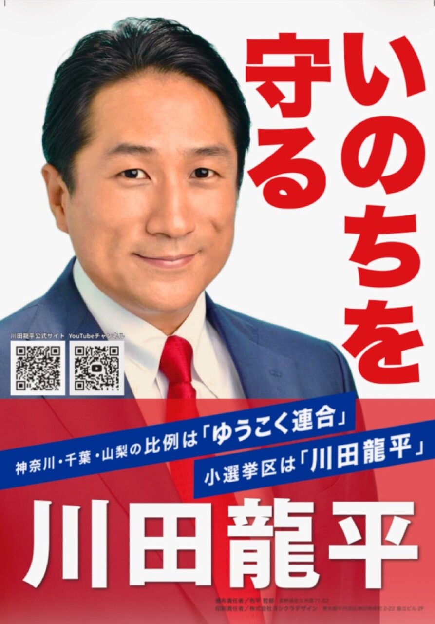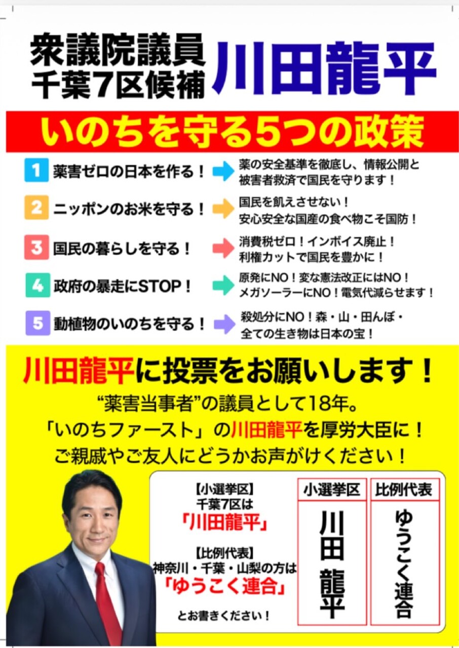 千葉7区には、川田氏の他、自民党の前職と国民民主党の新人が立候補している。ワクチン事業や緊急事態条項を含む憲法改正に反対しているのは、川田氏1人だ。比例代表の南関東ブロック(千葉・神奈川・山梨)に「減税日本・ゆうこく連合」は、@川田A高橋宏(49、千葉4区)の順で名簿を提出している。