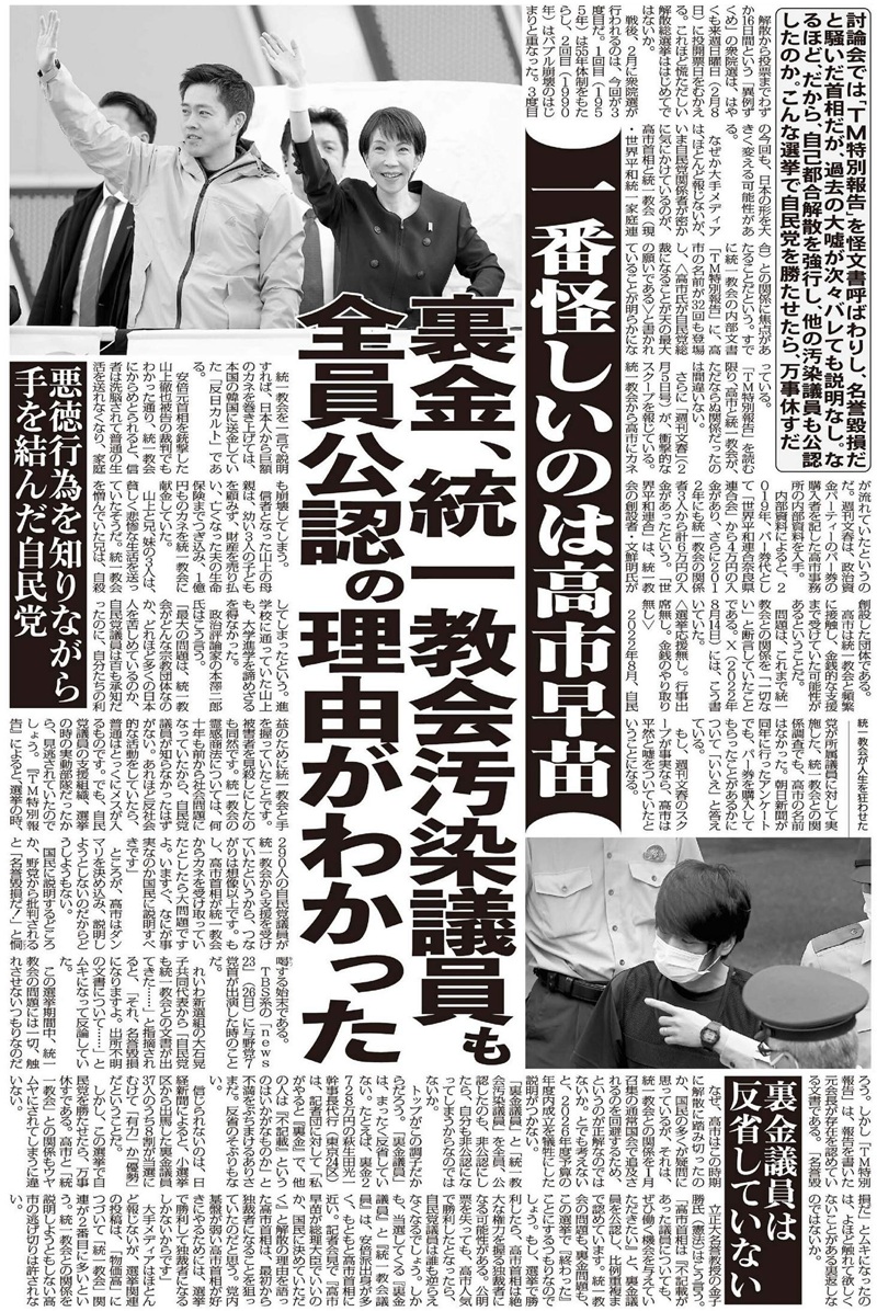 なぜ、高市はこの時期に解散に踏み切ったのか、国民の多くが疑問に思っているが、それは、統一教会との関係を1月召集の通常国会で追及されるのを回避するため、というのが正解なのではないか。とでも考えないと、2026年度予算の年度内成立を犠牲にした説明がつかない。