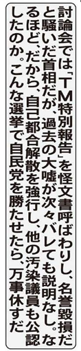討論会では「TM特別報告」を怪文書呼ばわりし、名誉棄損だと騒いだ首相だが、過去の大嘘がバレても説明なし。なるほど、だから、自己都合解散を強行し、他の汚染議員も公認したのか。こんな選挙で自民党を勝たせたら、万事休す。