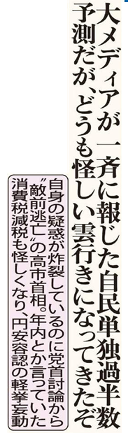 大メディアが一斉に報じた選挙序盤の情勢調査では、自民単独過半数は確実とされているが、どうも雲行きが怪しくなってきたのではないか。