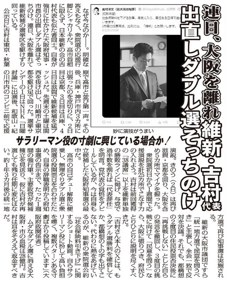「吉村さん本人のXには、もうダブル選勝利を確信してか、都構想のトの字も出てこない。代わりに熱をあげているのが、維新の衆院選公約『社会保険料引き下げ』に関するショート動画。自らサラリーマン役に扮して高い負担を嘆く、複数パターンある寸劇ばかり投稿しています」(大阪府政関係者)