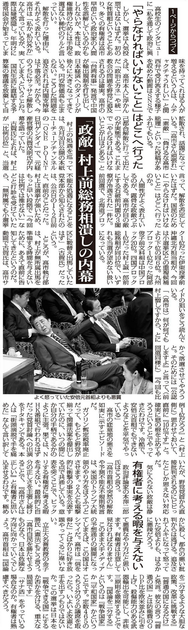 「(高市は)何が何でも村上憎しですから、とにかく落選させてやろうと。そのためには『公認しますよ』と言って、(前回選同様に)『今回も比例1位だろう』と(村上側に)思わせておいて、直前に『10位です』と。確実に息の根を止めてやろうということでやってきたわけです。冷酷で、安倍元首相でもできないようなことを平気でやっている」