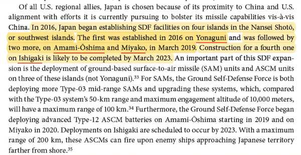 アメリカ国防総省系のシンクタンク「RANDコーポレーション」が2022年4月に発表した報告書によると、GBIRM(地上配備中距離弾道ミサイル)で中国を包囲する計画を彼らは持っている。日本は国防総省の計画に基づき、GBIRM(地上配備中距離弾道ミサイル)で中国を包囲する計画を進め、自衛隊は2016年に与那国島でミサイル発射施設を建設、19年には奄美大島と宮古島、そして23年には石垣島でも施設を完成させた。