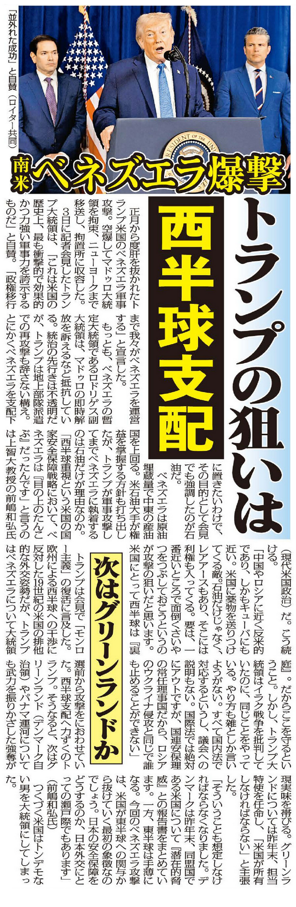 トランプ大統領は会見で「モンロー主義」の復活に言及した。欧州による西半球への干渉に反対した19世紀の米国の排他的な外交姿勢だが、トランプ大統領はベネズエラについて大統領選前から攻撃をにおわせていた。西半球支配へ力ずくのトランプ大統領。そうなると、次はグリーンランド(デンマーク自治領)やパナマ運河についても武力を振りかざした強奪が現実味を帯びる。グリーンランドについては昨年末、担当特使を任命し、「米国が所有しなければならない」と主張した。