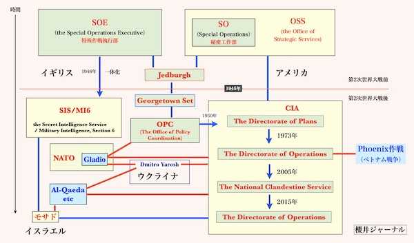 アメリカSO(OSSの一部門)とイギリスSOEは1944年にレジスタンスを抑え込むためにゲリラ戦部隊のジェドバラを編成、大戦後にはそれを核にしてアメリカやNATOの内部に破壊工作部隊を作った。大戦後、この部隊を基盤にして秘密部隊のネットワークが組織される。そのネットワークの中で最も活発に活動したグラディオはレジスタンスの人気が高かったイタリアの組織。NATOが誕生するとネットワークはその中へ入り込み、1951年からCPC(秘密計画委員会)の下で活動するようになる。1957年にはCPCの下部組織としてACC(連合軍秘密委員会)が創設された。(Daniele Ganser, “NATO’s Secret Armies”, Frank Cass, 2005)