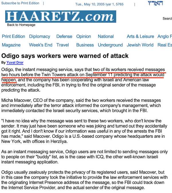 9/11の前後に「イスラエル人美術学生」が逮捕されていることも話題になった。イギリスのテレグラフ紙によると、攻撃の前に140名のイスラエル人が逮捕され(Telegraph, March 7, 2002)、ワシントン・ポスト紙によると、事件後に60名以上が逮捕されている。(Washington Post, November 23, 2001)合計すると逮捕者は200名に達し、その中にはモサドのメンバーも含まれていた。後に全員が国外追放になる。