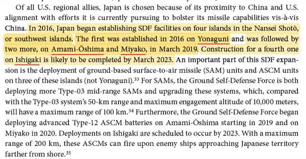 自衛隊は2016年、与那国島にミサイル発射施設を建設、それに続いて19年には奄美大島と宮古島、そして23年には石垣島でも施設を完成させた。与那国島を除く3島へASCM(地上配備型対艦巡航ミサイル)部隊とSAM(地上配備型地対空ミサイル)部隊の配備が重要だとアメリカ国防総省系のシンクタンク「RANDコーポレーション」が2022年4月に発表した報告書は説明している。アメリカ軍はGBIRM(地上配備中距離弾道ミサイル)で中国を包囲しようとしている。