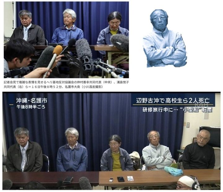 問題の会見写真では、ある人物が意図的にフレームから外されているのではないかという批判が噴出しています 。その人物とは、活動団体の幹部である安次富浩氏です 。他メディアの映像では、彼が腕組みをして並んでいる姿がはっきりと映っていますが、一部の報道ではそこがカットされているように見えます 。
