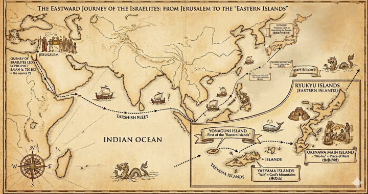 イスラエルの南ユダ王国を脱出したイザヤの一行は、護衛しなければならない大切な神宝を携えていることもあり、タルシシュ船のような船団を準備してアジア大陸を海岸沿いに航海し、その東の果てから日本列島を目指して航海したと考えられます。イザヤ書に記されているとおり、イザヤは「東の島々」に約束の新天地があることを理解していました。そしてアジア大陸の南岸沿い東方へと向かい、長旅を続けてきた後、台湾、与那国島から先に浮かぶ島々を目にした時、目的とする「東の島々」の一端に到達したことを喜んだに違いありません。