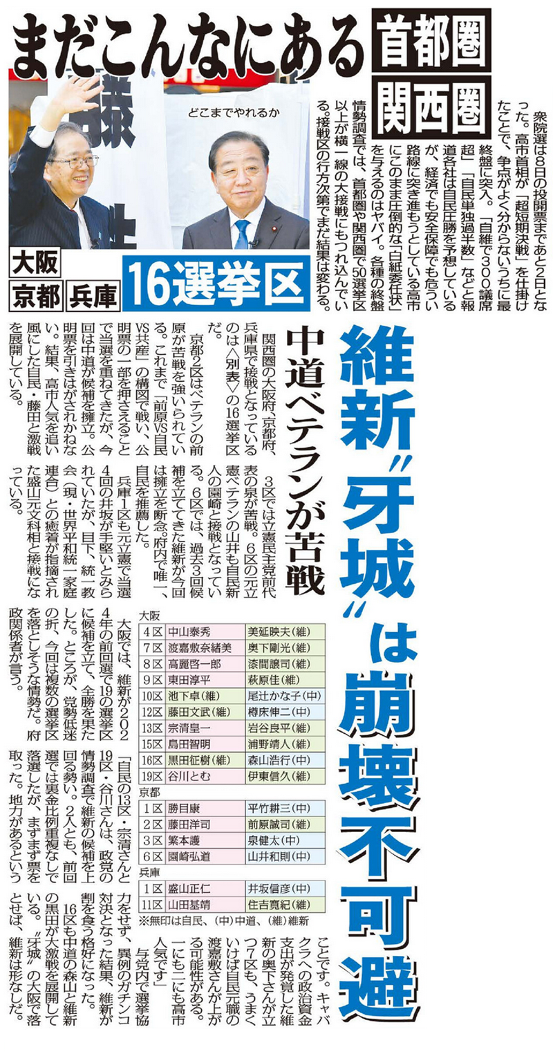 16区も中道の森山氏と維新の黒田氏が大激戦を展開している。“牙城”の大阪で落とせば、維新は形なしだ。