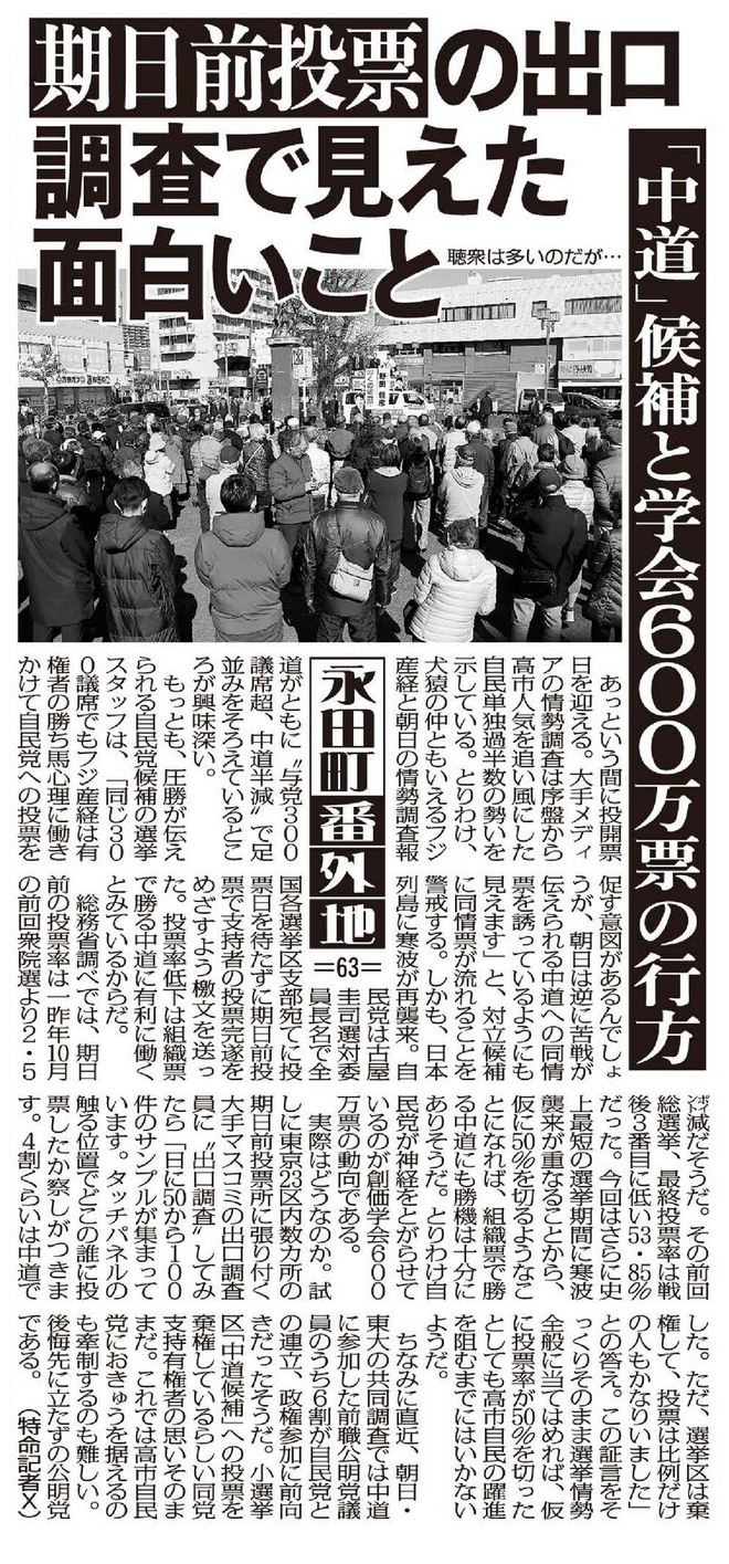 総務省調べでは、期日前の投票率は一昨年10月の前回衆院選より2.5ポイント減だそうだ。その前回総選挙、最終投票率は戦後3番目に低い53.85%だった。今回はさらに史上最短の選挙期間に寒波襲来が重なることから、仮に50%を切るようなことになれば、組織票で勝る中道にも勝機は十分にありそうだ。とりわけ自民党が神経をとがらせているのが創価学会600万票の動向である。