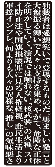 独裁者は愛想笑いで登場するものだ。勇ましい発言と大盤振る舞いで人々の支持を集め、やがて、危険な正体を明かしていく。演説では触れない「核武装」の火種、スパイ防止法や国旗損壊罪に見る人権軽視、庶民生活より軍拡インフレ、何よりも人々の異様な「推し」の気味悪さ。