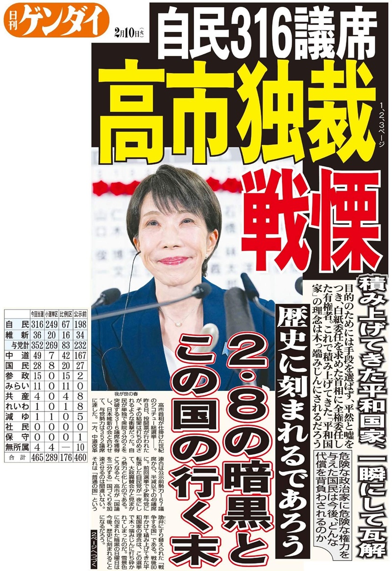 はしゃぐ高市は今や、我が世の春である。ヒトラーも1933年、内閣発足2日後に議会を解散し、その後、全権委任法案を可決、議会を形骸化させているが、高市奇襲選挙にも似たようなにおいが付きまとう。もともと極右の政治家が中国を敵視し、軍拡・武器輸出全面解禁、インテリジェンス強化という監視強化、憲法改正まで打ち出しているのだからなおさらだ。この選挙で、日本が戦後80年かけて築き上げてきた平和国家の理想、理念は完全に消えてしまった。