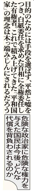 目的のためには手段を選ばず、平然と嘘をつき、白紙委任を求めた首相に全権委任した有権者。これで積み上げてきた「平和国家」の理念は木っ端みじんにされるだろう。