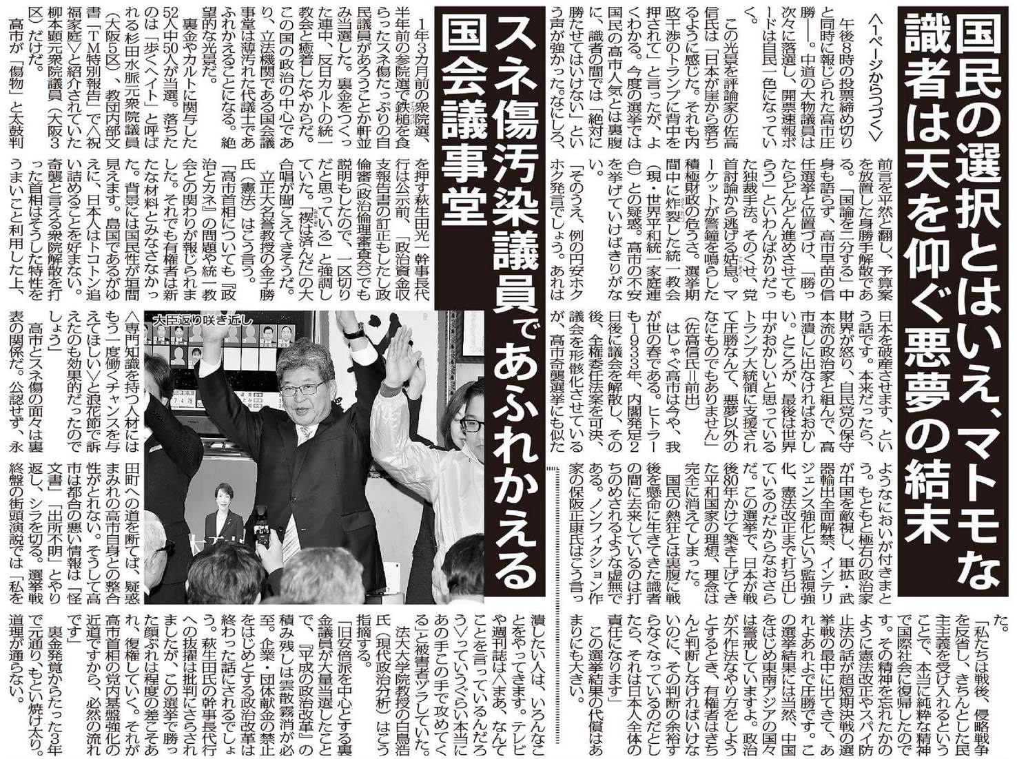 高市とスネ傷の面々は裏表の関係だ。公認せず、永田町への道を断てば、疑惑まみれの高市自身との整合性がとれない。そうして高市は都合の悪い情報は「怪文書」「出所不明」とやり返し、シラを切る。選挙戦終盤の街頭演説では「私を潰したい人は、いろんなことをやってきます。テレビや週刊誌は〈まあ、なんてことを言っているんだろう〉っていうぐらい本当にあの手この手で攻めてくる」と被害者ヅラしていた。
