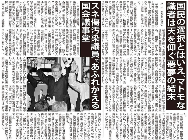 1年3カ月前の衆院選、半年前の参院選で鉄槌を食らったスネ傷たっぷりの自民議員があろうことか軒並み当選した。裏金をつくった連中、反日カルトの統一教会と癒着したやからだ。この国の政治の中心であり、立法機関である国会議事堂は薄汚れた代議士であふれかえることになる。絶望的な光景だ。