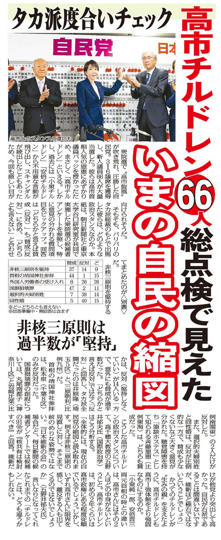 高市チルドレンのタカ派度をチェック 新人議員66人総点検で見えた「いまの自民の縮図」