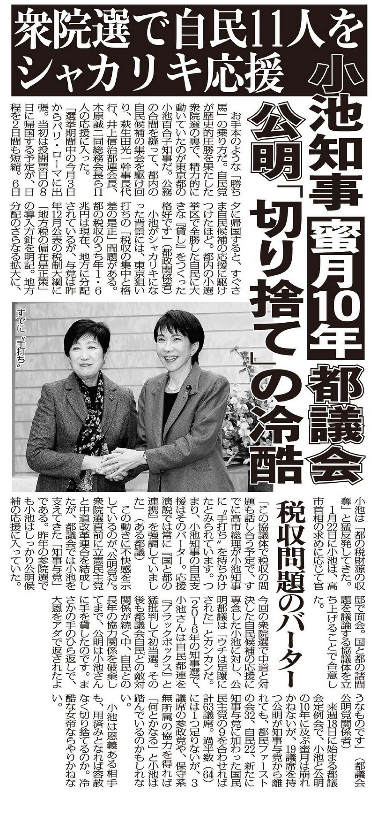 この動きに不快感を示しているのが、公明党だ。衆院選直前に立憲民主党と中道改革連合を結成したが、都議会では小池知事を支えてきた「知事与党」である。昨年の参院選でも小池はしっかり公明候補の応援に入っていた。今回の衆院選で中道と対決した自民候補の応援に専念した小池知事に対し、公明都議は「ウチは足蹴にされた」とカンカンだ。