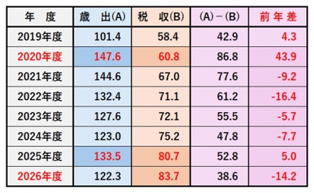 ところが、高市内閣が補正予算を編成して25年度の歳出を134兆円に再膨張させた。
