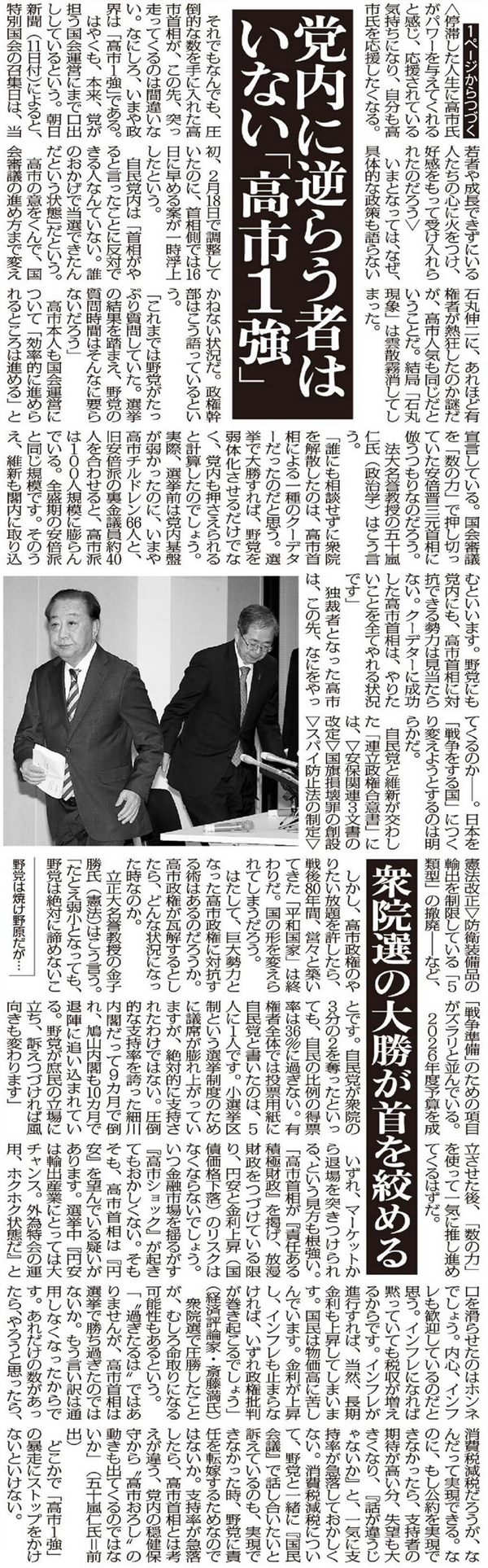 どこかで「高市1強」の暴走にストップをかけないといけない。