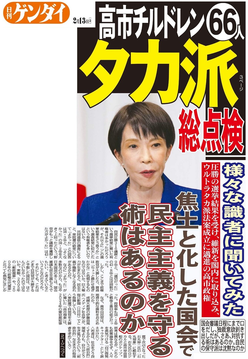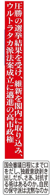 圧勝の選挙結果を受け、維新を閣内に取り込み、ウルトラタカ派法案成立に邁進の高市政権。国会審議日程にまで口をだし、独占意欲剥き出しだが、さあ、対抗する術はあるのか。自民の保守は沈黙なのか。