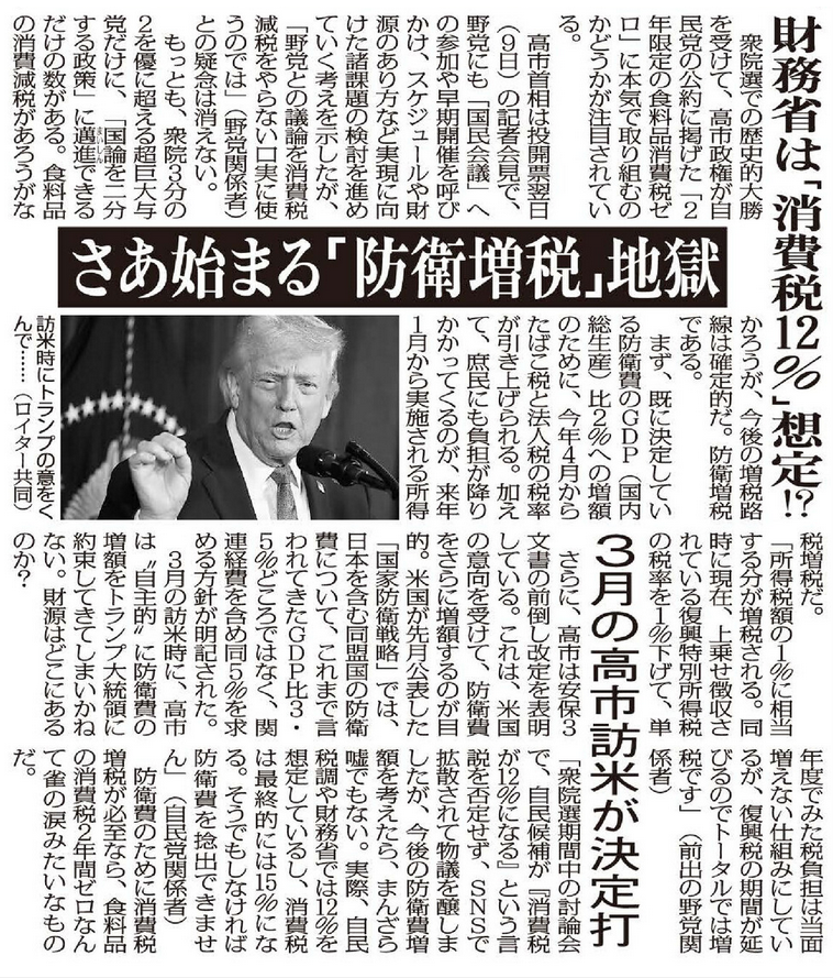 もっとも、衆院3分の2を優に超える超巨大与党だけに、「国論を二分する政策」に邁進できるだけの数がある。食料品の消費減税があろうがなかろうが、今後の増税路線は確定的だ。防衛増税である。