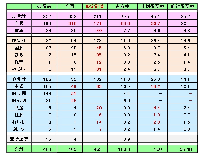 今回総選挙の議席配分を比例代表得票率で案分した「仮定計算」を行った。