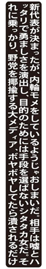 新代表が決まったが、内輪モメをしているようじゃおしまいだ。相手は嘘とハッタリで勇ましさを演出し、目的のためには手段を選ばないシタタカ女だ。それに乗っかり、野党を揶揄する大メディア、ボヤボヤしてたら潰されるだけ。