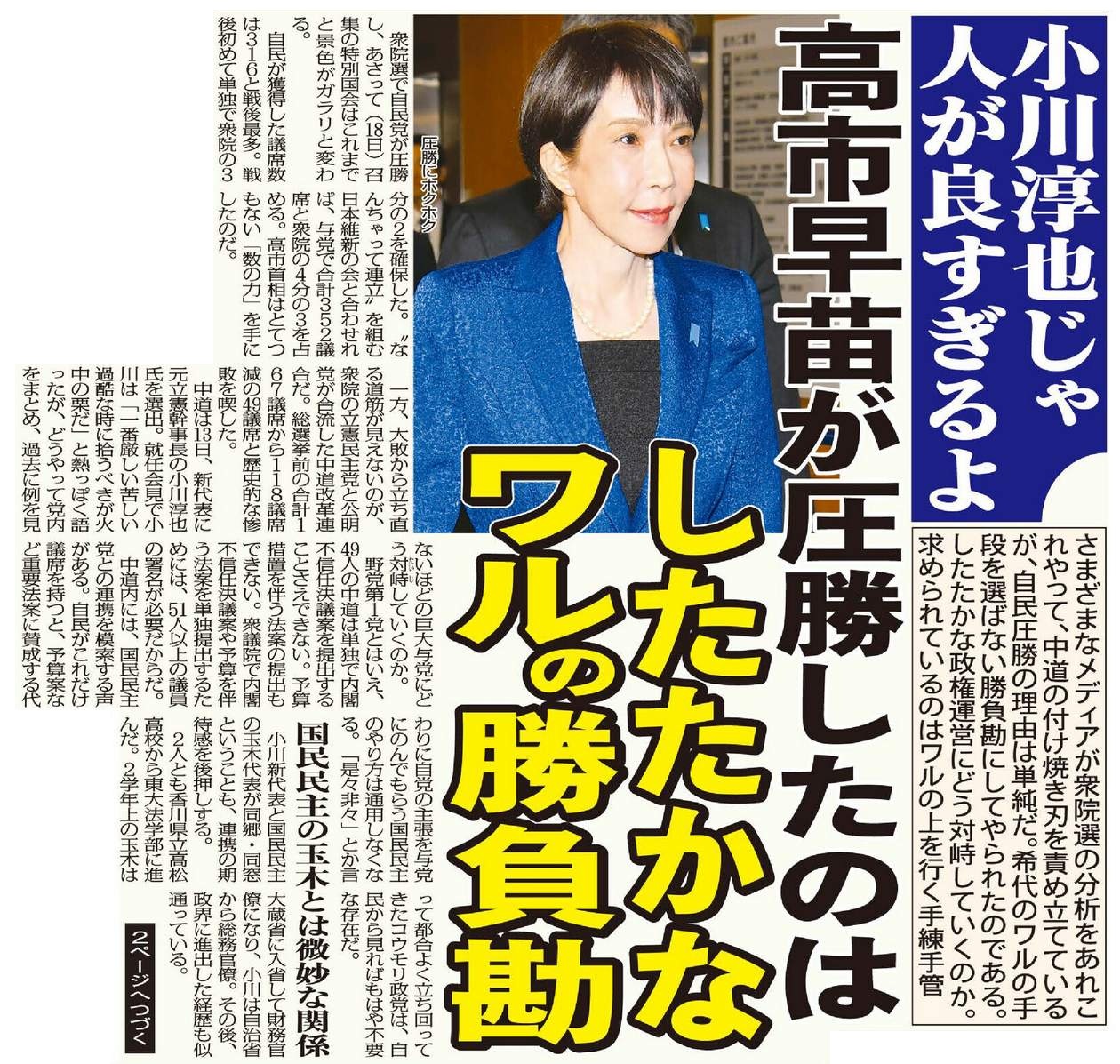 ただ、高市にあって小川にないものがズル賢さと言える。勝つためには手段を選ばない希代のワルに、優等生の正論で太刀打ちできるのか。