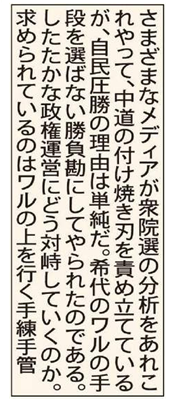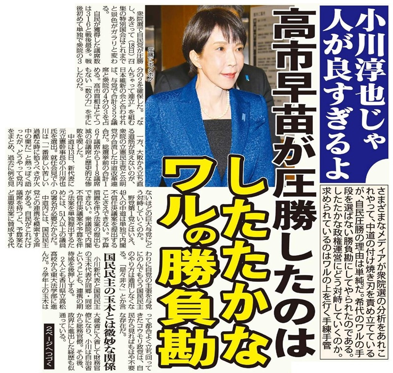 さまざまなメディアが衆院選の分析をあれこれやって、中道の付け焼き刃を責め立てているが、自民圧勝の理由は単純だ。稀代のワルの手段を選ばない勝負勘にしてやられたのである。したたかな政権運営にどう対峙していくのか。求められているのはワルの上を行く手練手管。