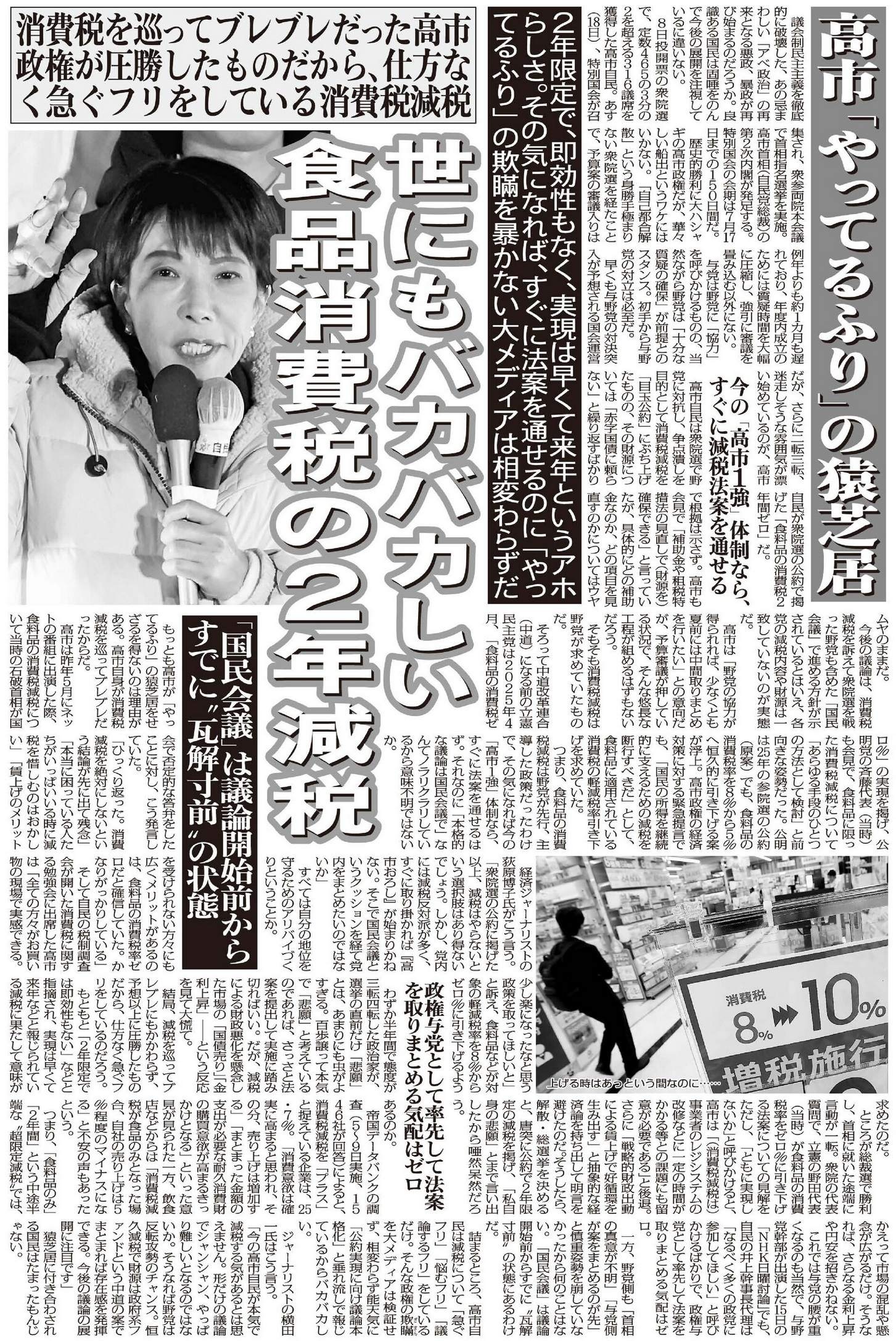 もっとも高市が「やってるふり」の猿芝居をせざるを得ないのは理由がある。高市自身が消費税減税を巡ってブレブレだったからだ。