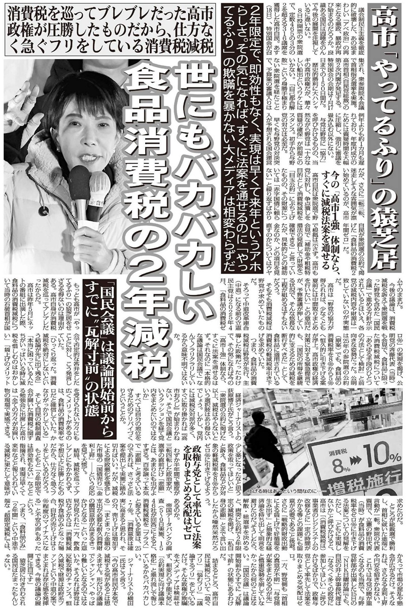 詰まるところ、高市自民は減税について「急ぐフリ」「悩むフリ」「議論するフリ」をしているだけ。そんな政権の欺瞞を大メディアは検証せず、相変わらず能天気に「公約実現に向け議論本格化」と垂れ流しで報じているからバカバカしい。