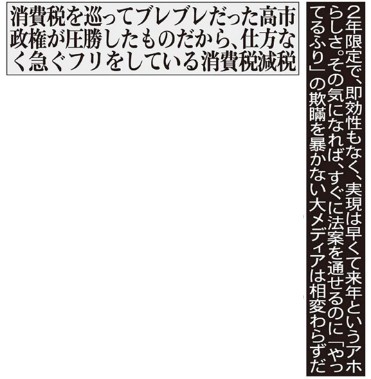 2年限定で、即効性もなく、実現は早くて来年というアホらしさ。その気になれば、すぐに法案を通せるのに「やってるふり」の欺瞞を暴かない大メディアは相変わらずだ。