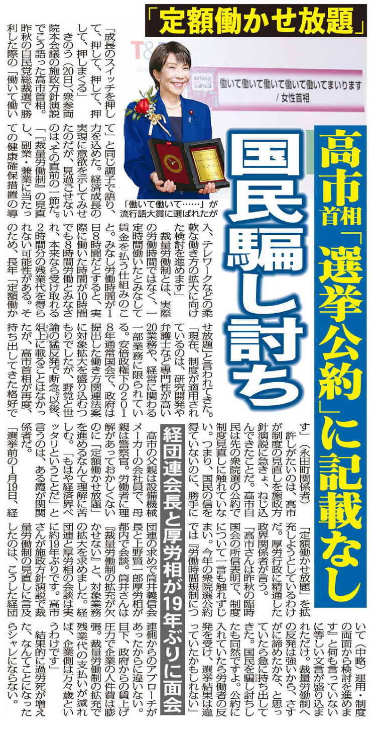 「高市さんは昨秋の臨時国会の所信表明で、制度について一言も触れずじまい。今年の衆院選公約では『労働時間規制について(中略)運用・制度の両面から検討を進めます』と何も言っていないに等しい文言が盛り込まれただけ。裁量労働制への反発は強いから、さすがに諦めたかな、と思っていたら急に持ち出してきた。国民を騙し討ちしたも同然ですよ。公約に入れていたら労働者の反発を受け、選挙結果は違っていたかもしれない」