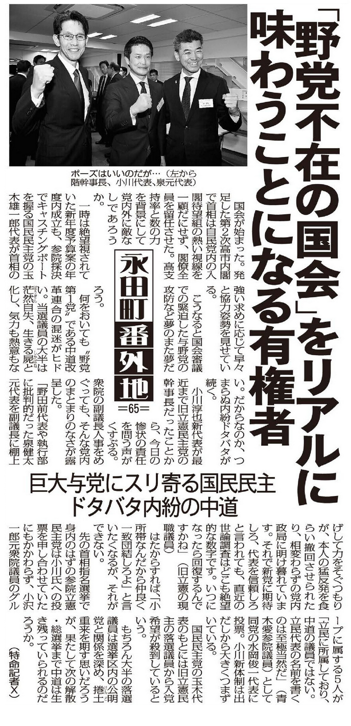 先の首相指名選挙で身内のはずの参院立憲民主党は小川氏への投票を申し合わせていたにもかかわらず、小沢一郎元衆院議員のグループに属する5人が「立民に所属しており、中道の議員ではない。立民代表の名前を書くのは至極当然だ」(青木愛参院議員)として同党の水岡俊一代表に投票。小川新体制は出だしから大きくつまずいている。